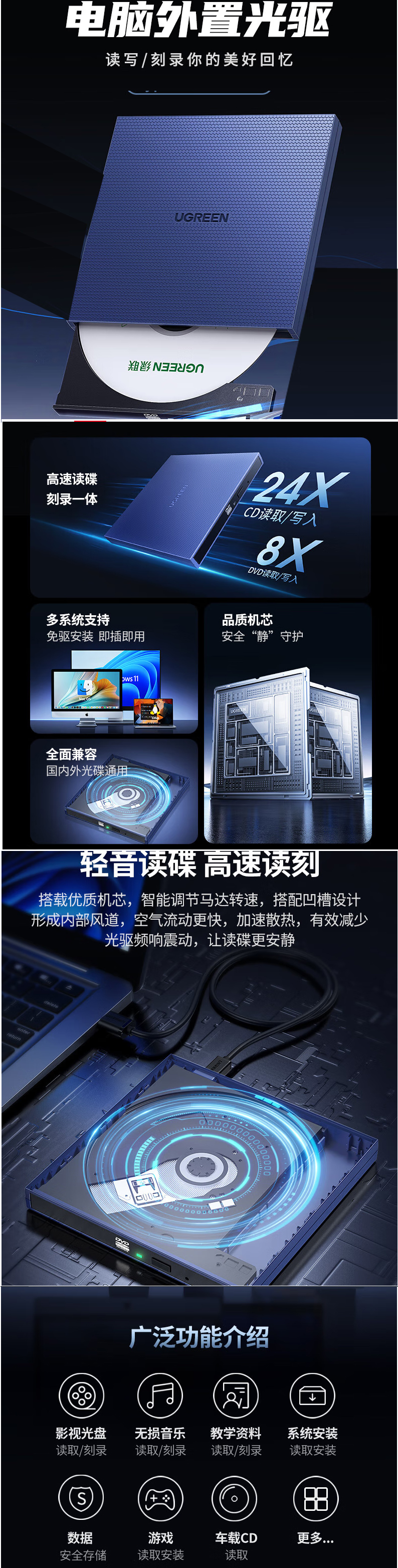 >绿联(UGREEN)40576 刻录机 USB外置DVD刻录机8倍速外置刻录